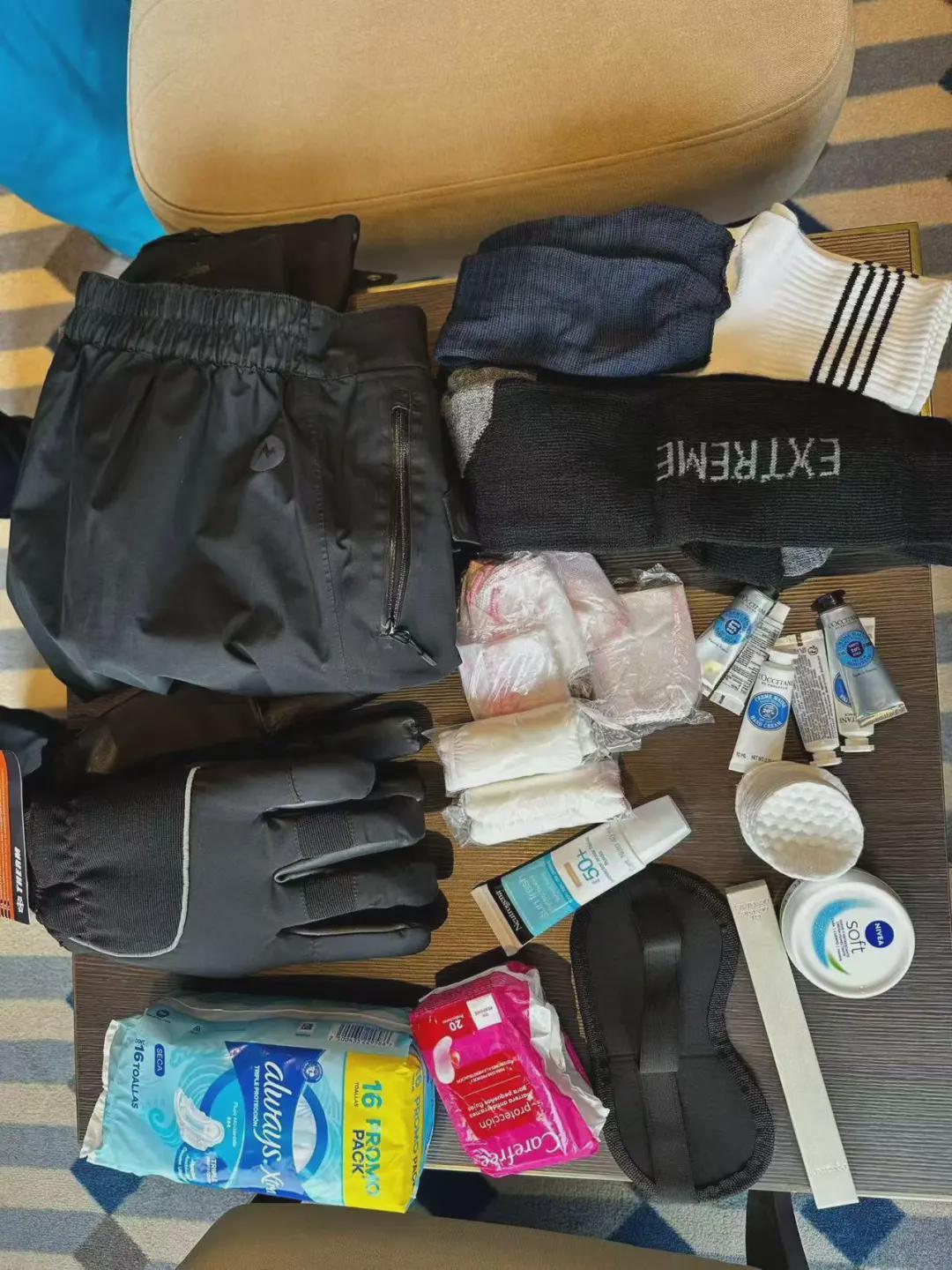 “我从不同的人那里借到了东西。”陆女士说,一位98年的江西小妹妹给了她两条轻薄裤子,一对蜜月夫妻借了她两件短袖,一位中国探险队员把自己的备用防水裤、防水手套借给她,还有一位70来岁的武汉阿姨和北京的两位女生都贴心地送了一次性用品。